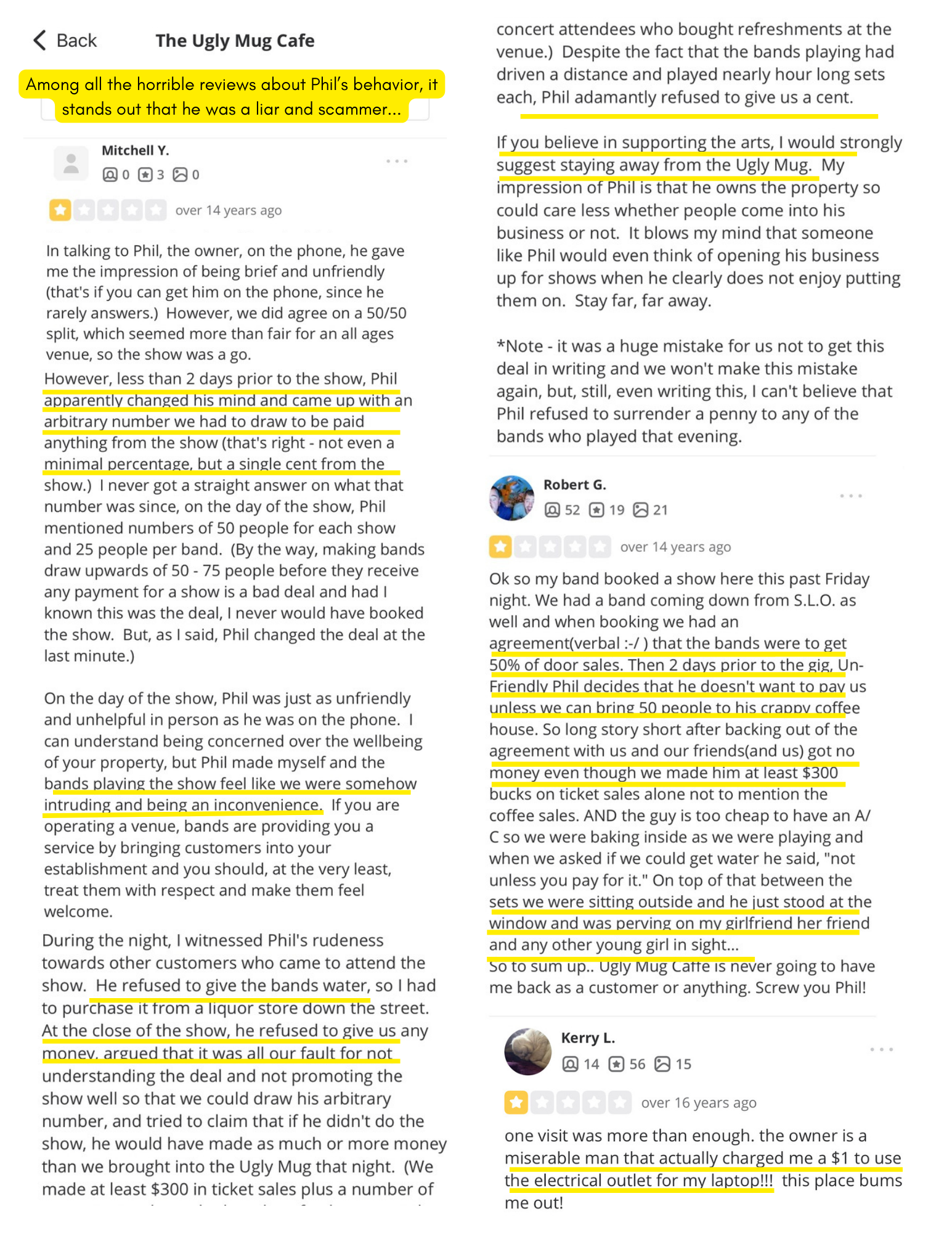 On Yelp, the Ugly Mug has 42 one- and two-star reviews, which outnumbers the 38 three-, four-, and five-star reviews. Overwhelmingly, most reviews say pretty much the same thing: Phil is rude, mean, insulting, offensive, belittling, snarling, berating, and condescending.